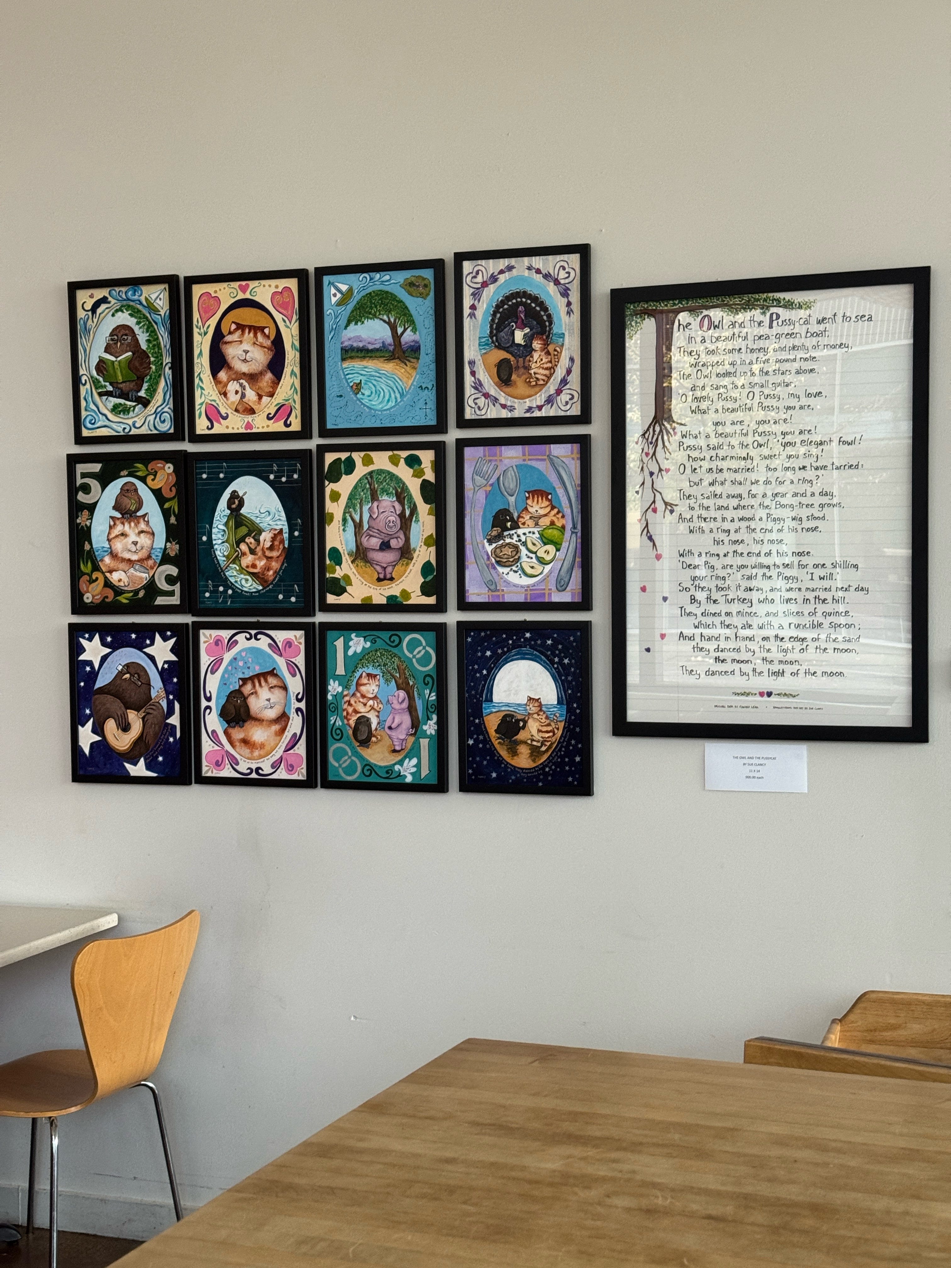 Earlier this week the Caplan Art Designs gallery hung my Owl and Pussycat series at a cafe near a health sciences campus called The Daily at the Tram!! How nice is this? I get to provide a bit of cheer for people working in or studying healthcare!! Here are the gallery details https://caplanartdesigns.com/ and more about my project here https://sueclancy.com/2025/11/11/nonsense-botany-and-the-owl-and-pussycat-update/