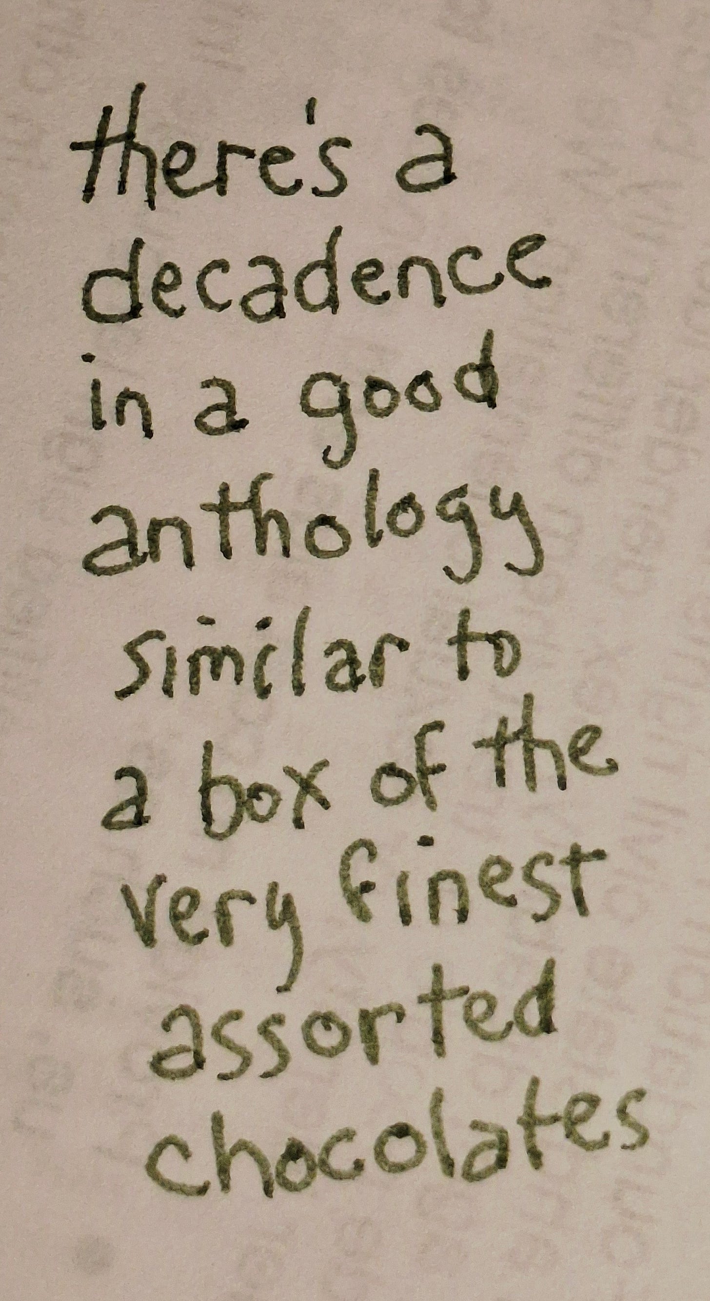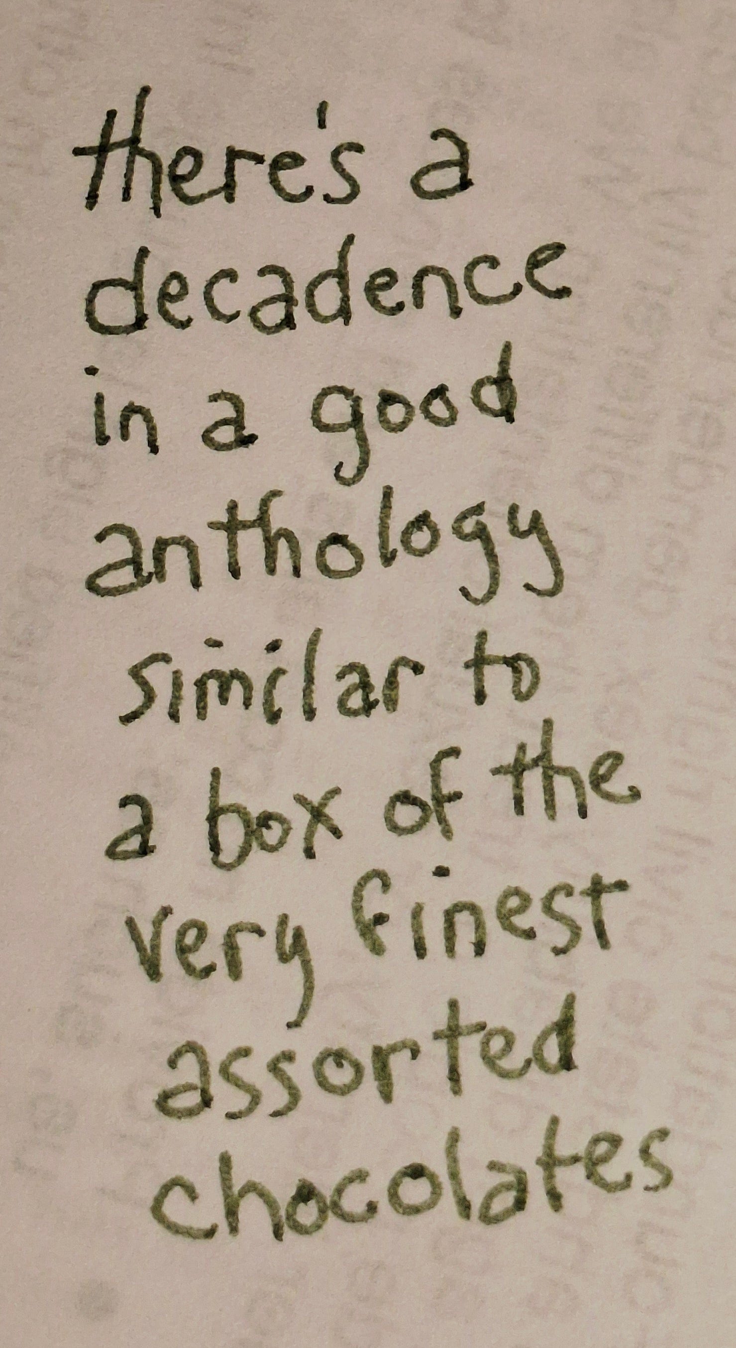 Often I think of my sketchbook as an anthology of my mornings. I really like a good anthology. I'm currently enjoying one I got from the public library when the cat and I sit together to read before going to bed.