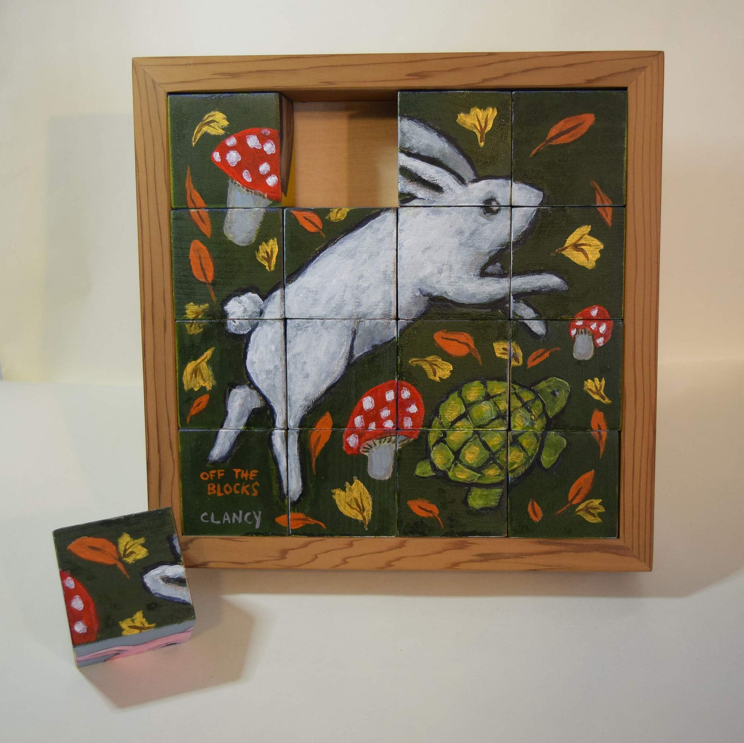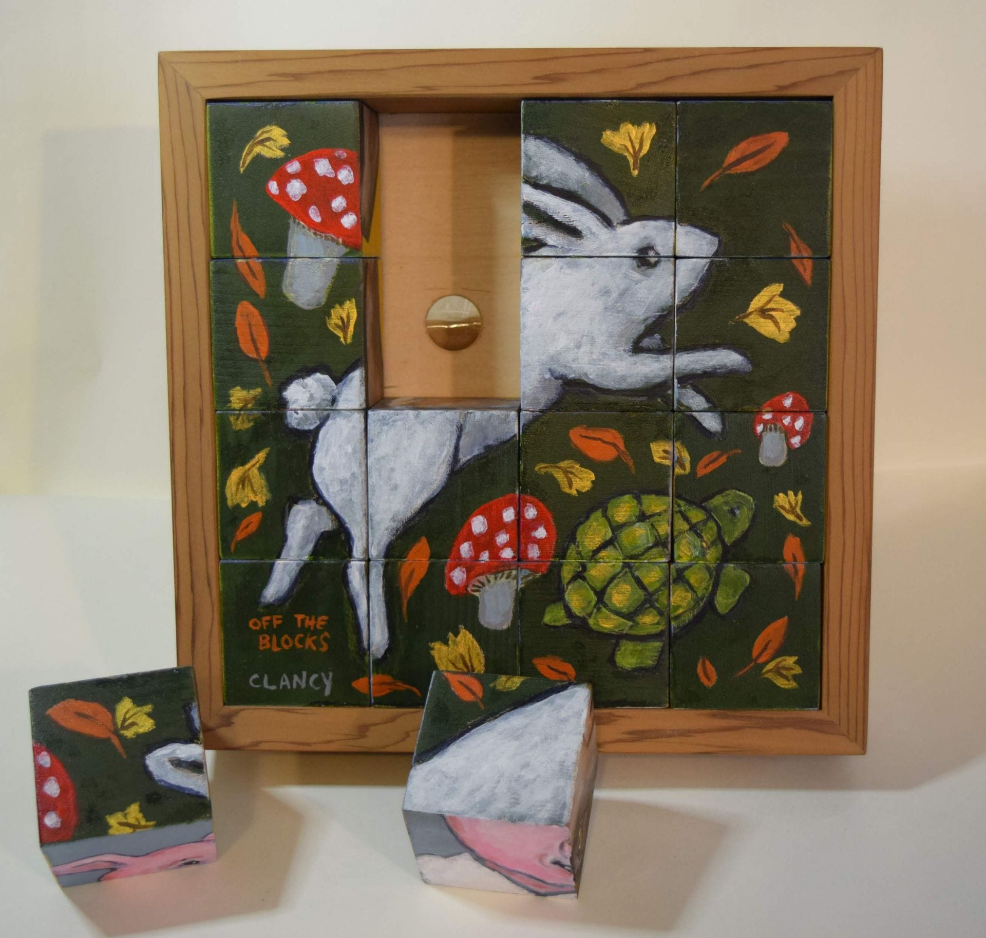 This month the Aurora Gallery is showing my dozen “Eggheads” art-toy along with my block puzzle art-toy! My 6 picture block puzzle is titled “Around The Block”. Its an art-toy where each of the 2 inch square blocks fit together make up each of the 6 art images.