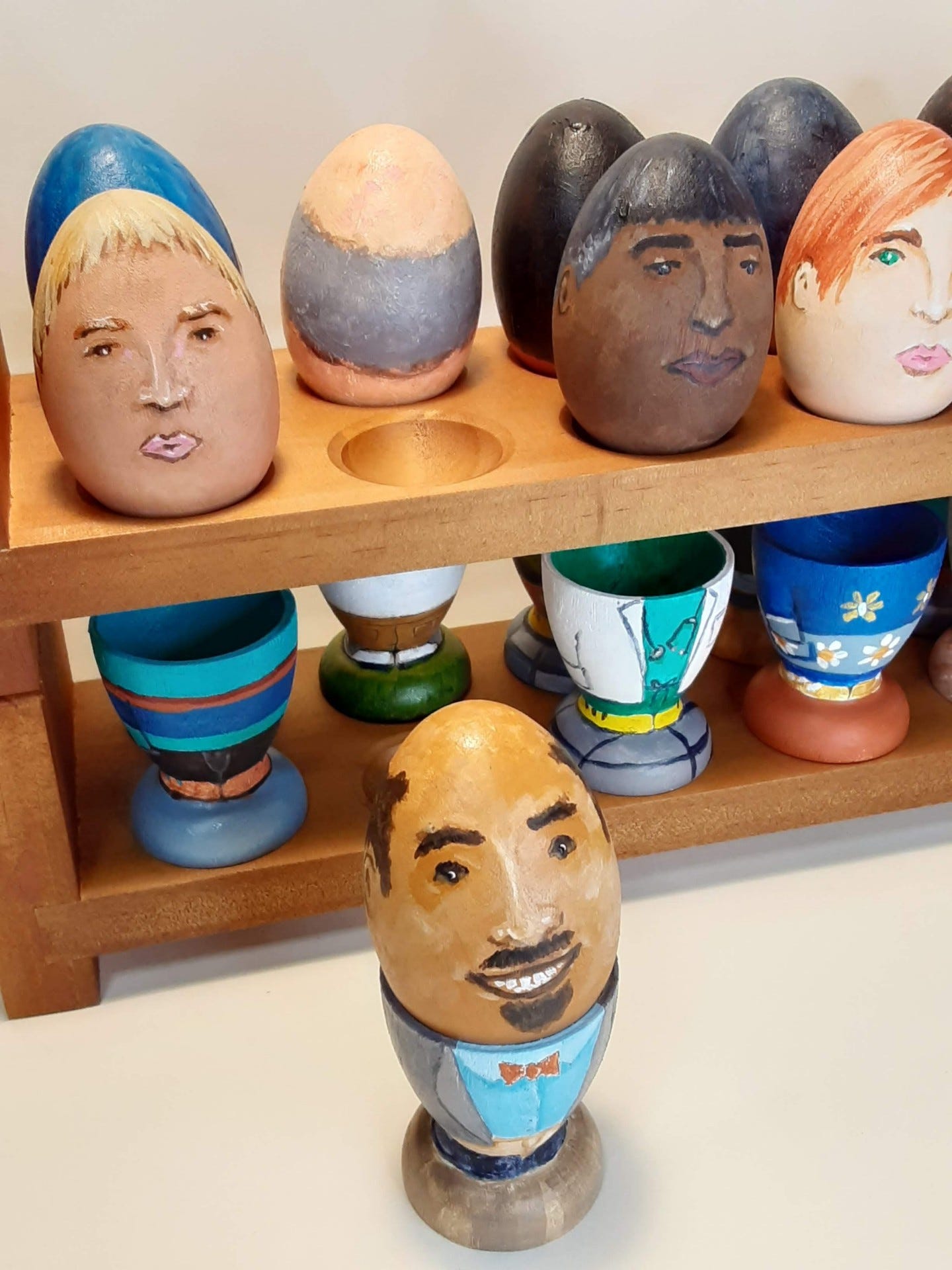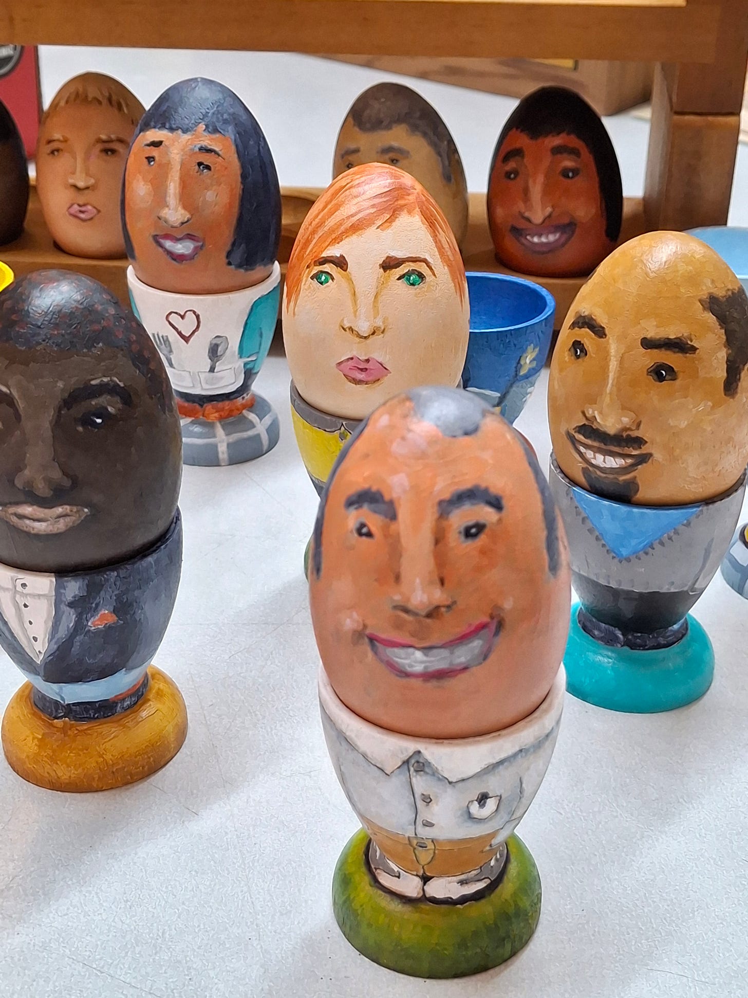 Each Egghead (head plus body) can be sold separately (and the gallery will ship anywhere). The Eggheads are handpainted wooden eggs and egg cups - each one unique - to mix, match as they make you smile. Whimsical art for the gentle love and humor in it!