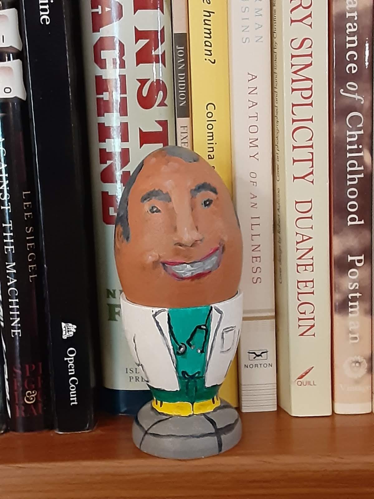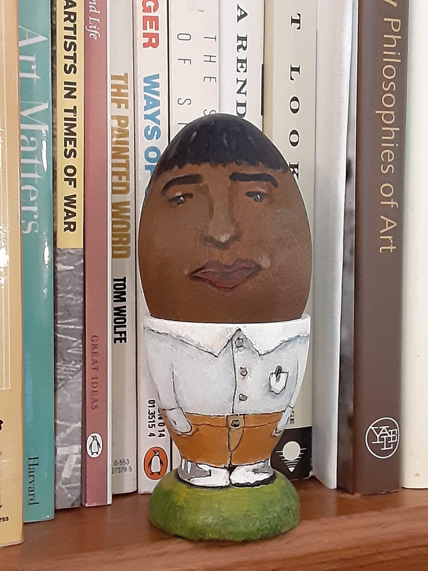 Some Eggheads in their natural habitat on bookshelves:
