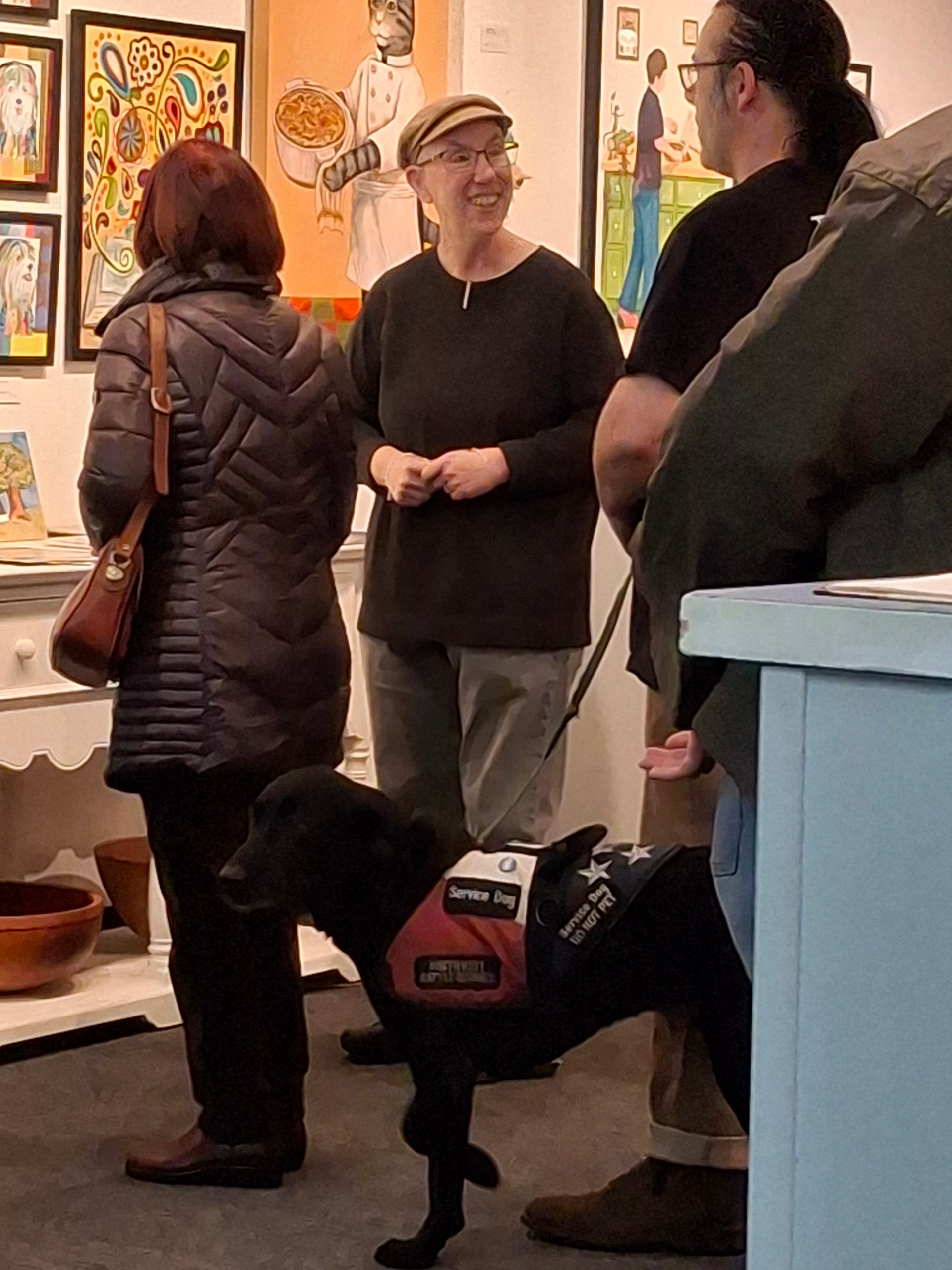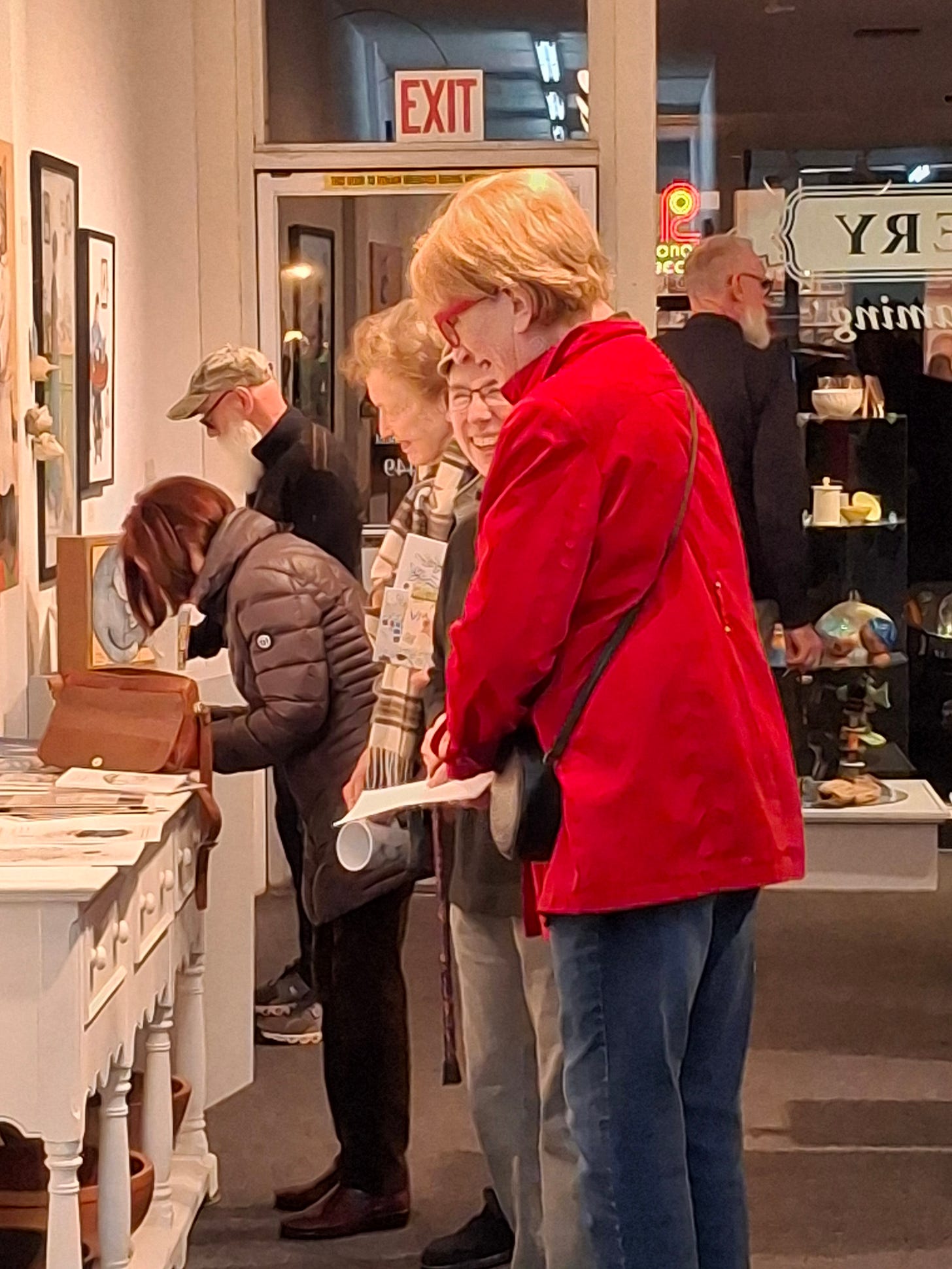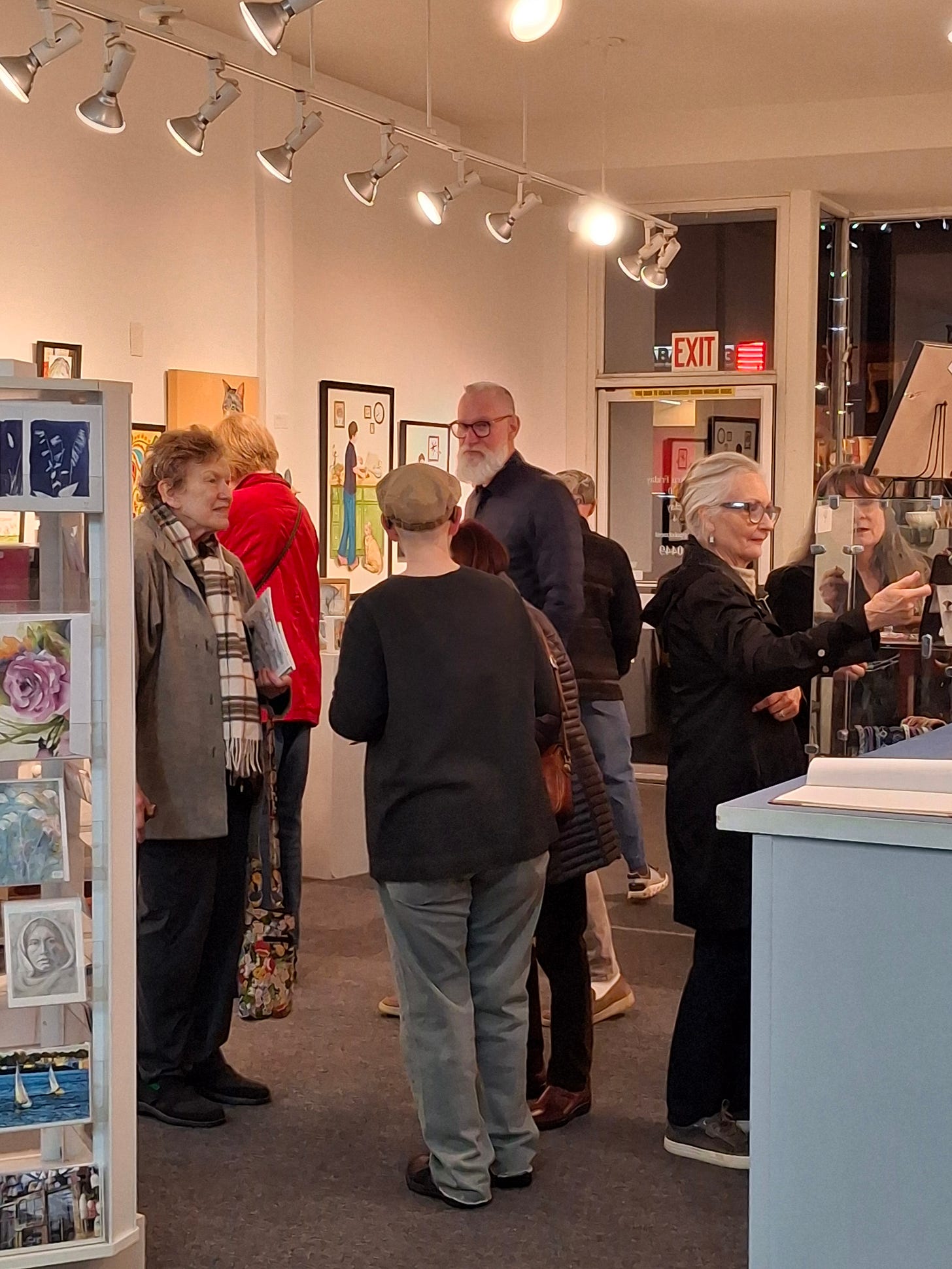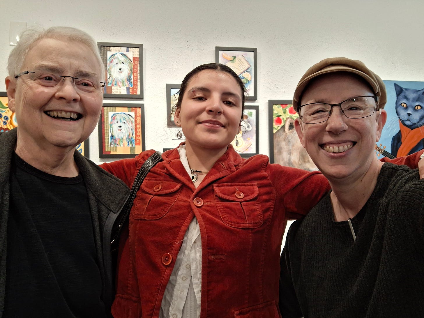 The Aurora Gallery did an incredible job displaying my wide variety of paintings, sculptures, artist books and cards! (There's a carousel of my greeting cards to the left of the artworks in the photo.) The opening party began at 5pm and my wife J. L. Sullens and I went early, or so we thought, only to discover we’d already missed a few folks.