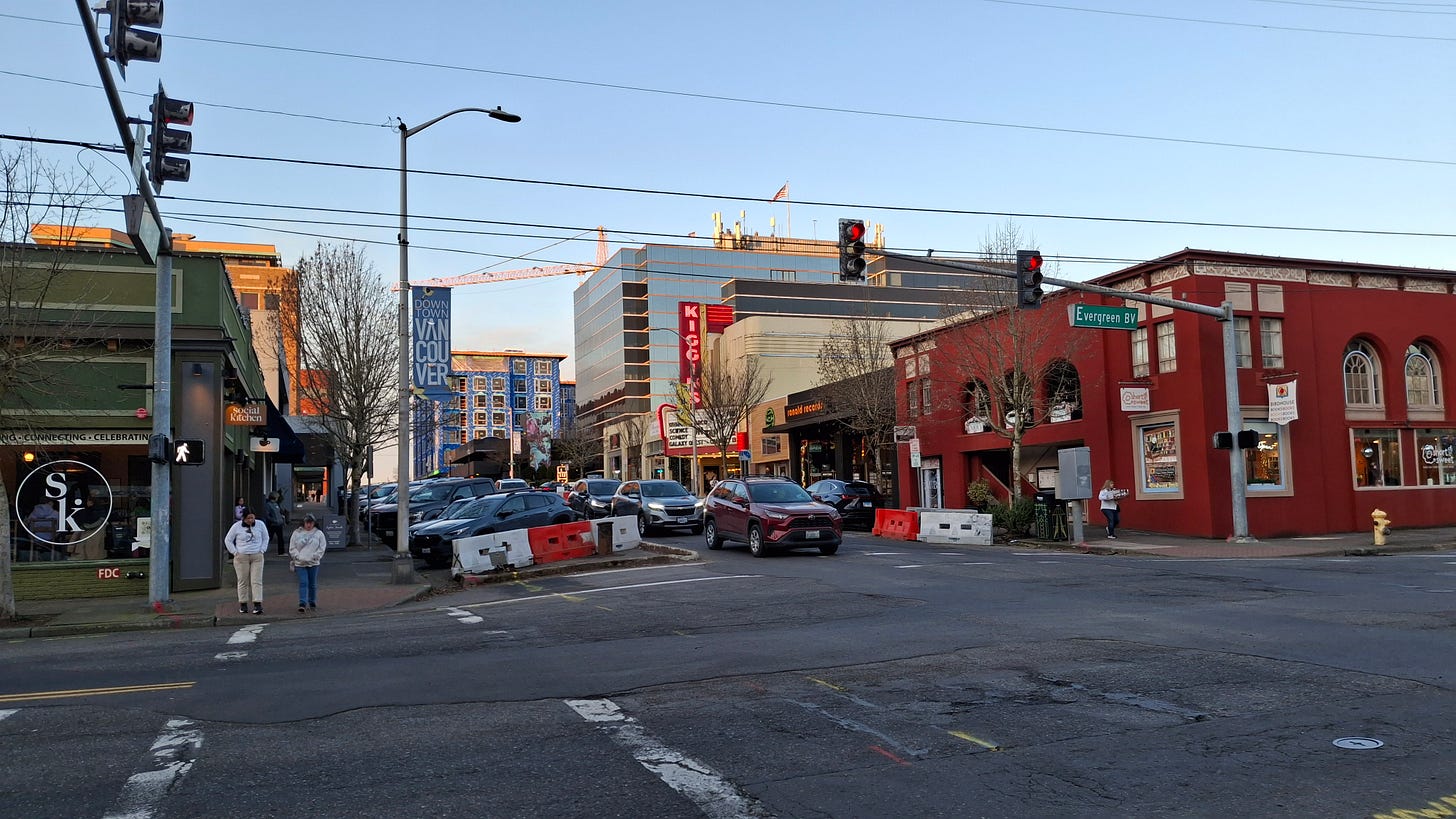 Here's the scene downtown as we walked to the gallery from where we found parking. The gallery is on the path we're walking; there's a place called “Social Kitchen” (SK), which is often cooking something that smells yummy and is filled with lots of people eating, talking, listening to music and laughing. Next door to the Social Kitchen is a coffee shop, Carino Coffee, that has (we know from experience) comfy chairs and good coffees; my favorite is their Mexican coffee but I digress. The Aurora Gallery is next door to the coffee shop. Next door, on the other side, to the gallery is Eryngium Paperterie - the enchanting pens, ink, paper, notebooks, sketchbooks magic rabbit hole I've mentioned before. Across the street is a bookstore, a record store, a historical theater, an Irish pub… Literally this downtown block is my idea of heaven! The city is currently repairing the street so that's why there's orange and white barriers… anyway, the scene downtown as we walked to the gallery: