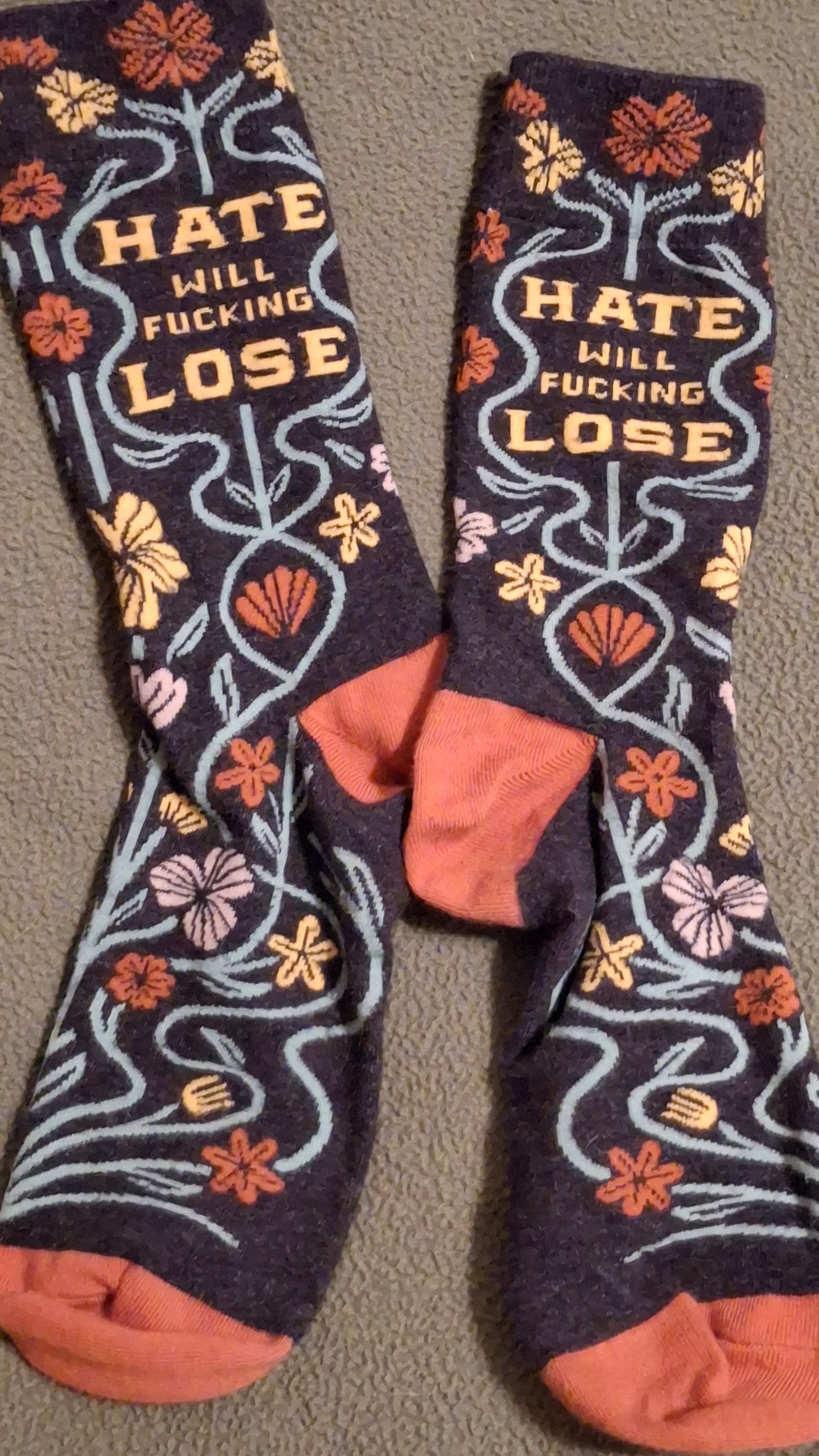 When getting ready for the evening I wore my “Hate Will Fucking Lose” socks…