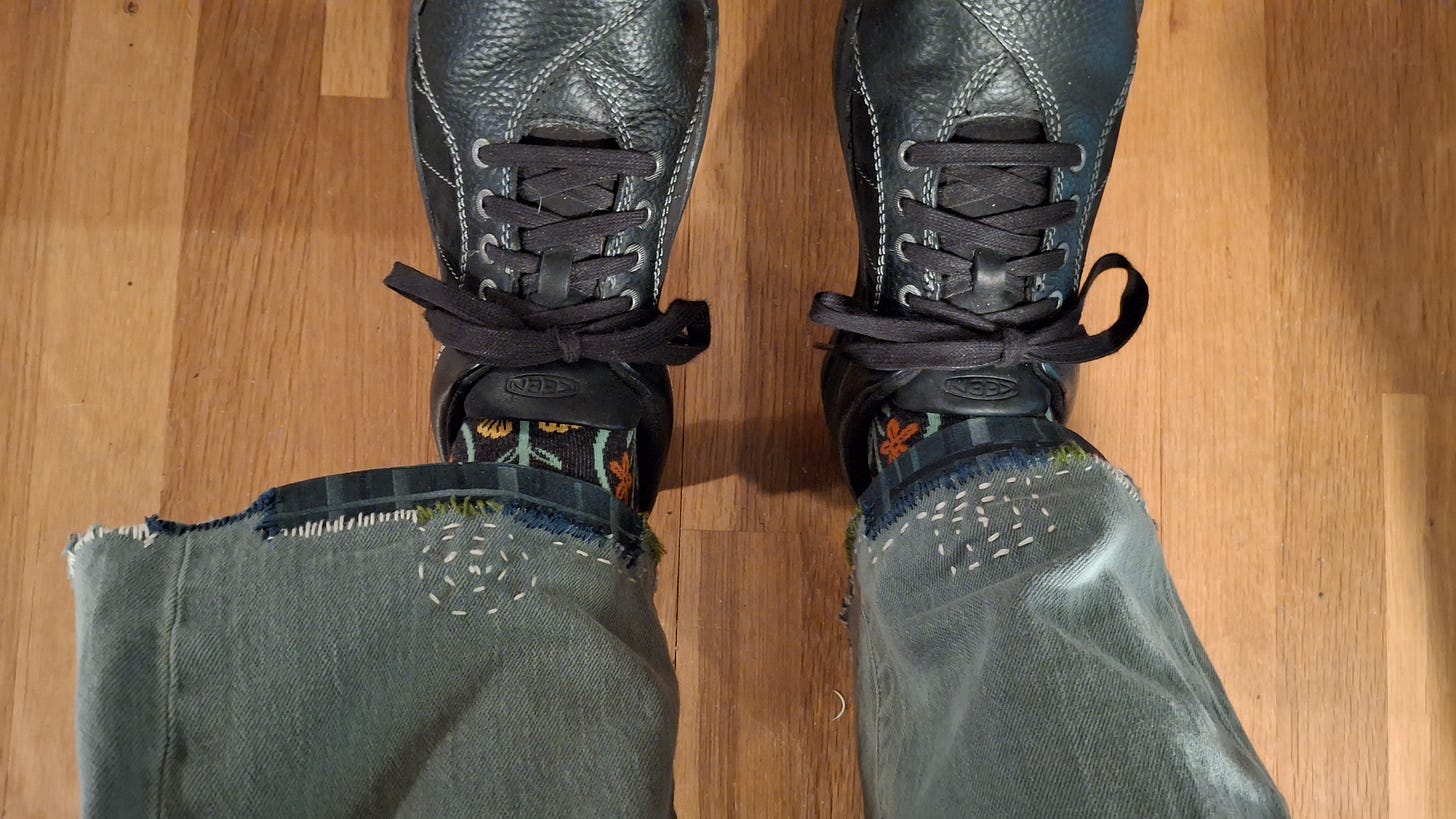 … my 5 dollar thrift store pants which are a nice color, and fit perfectly except for being too long. I did some “creative mending” and made them a better length. In the photo I'm pulling up one of the pant legs so you can see my silly stitching. These pants make me smile so for the comfort in it I chose to wear them to my exhibit …