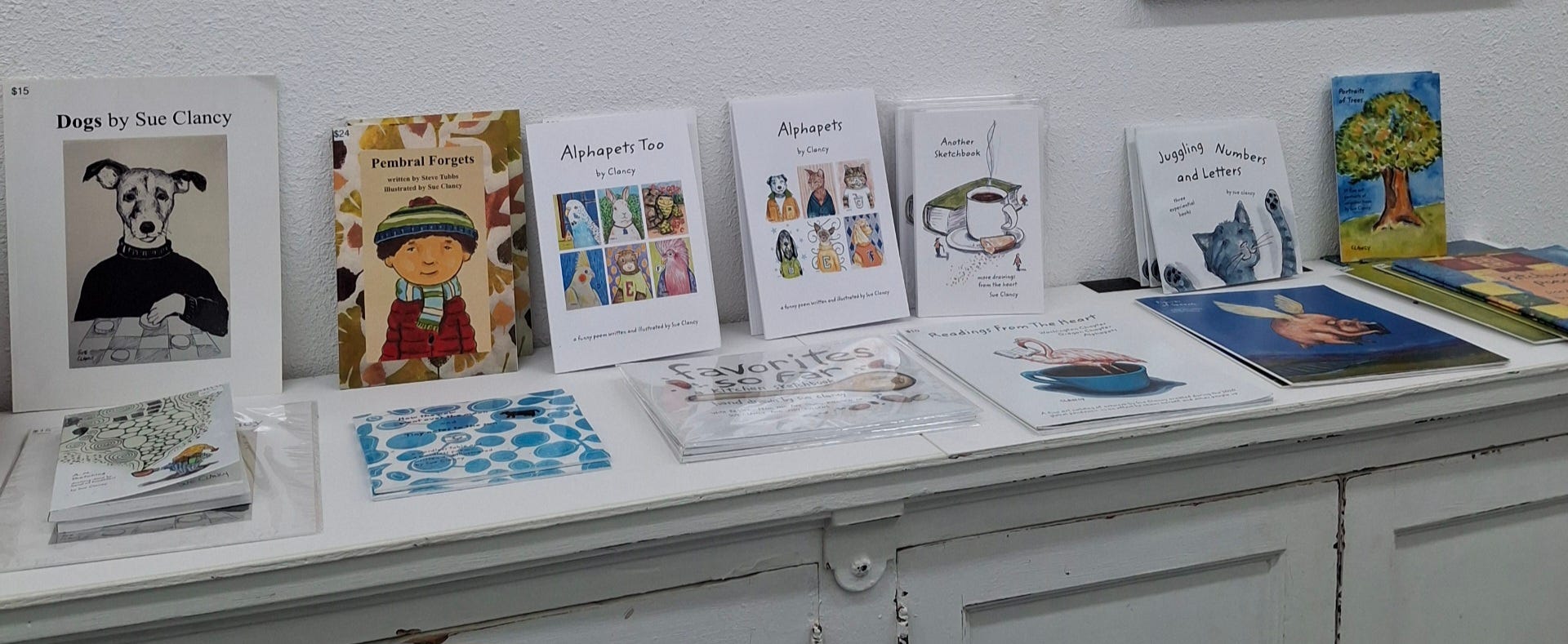 … And as for the artist books on the above pictured shelf in the gallery: many of them are available on Substack (link here) and from the bottom of my page on Blurb (link here). My children's books are available as free ebooks on Storyberries from the bottom of my profile page (link here). Most of the above links will give you free previews of entire books. You may wish for a second cuppa if you click and read 😉