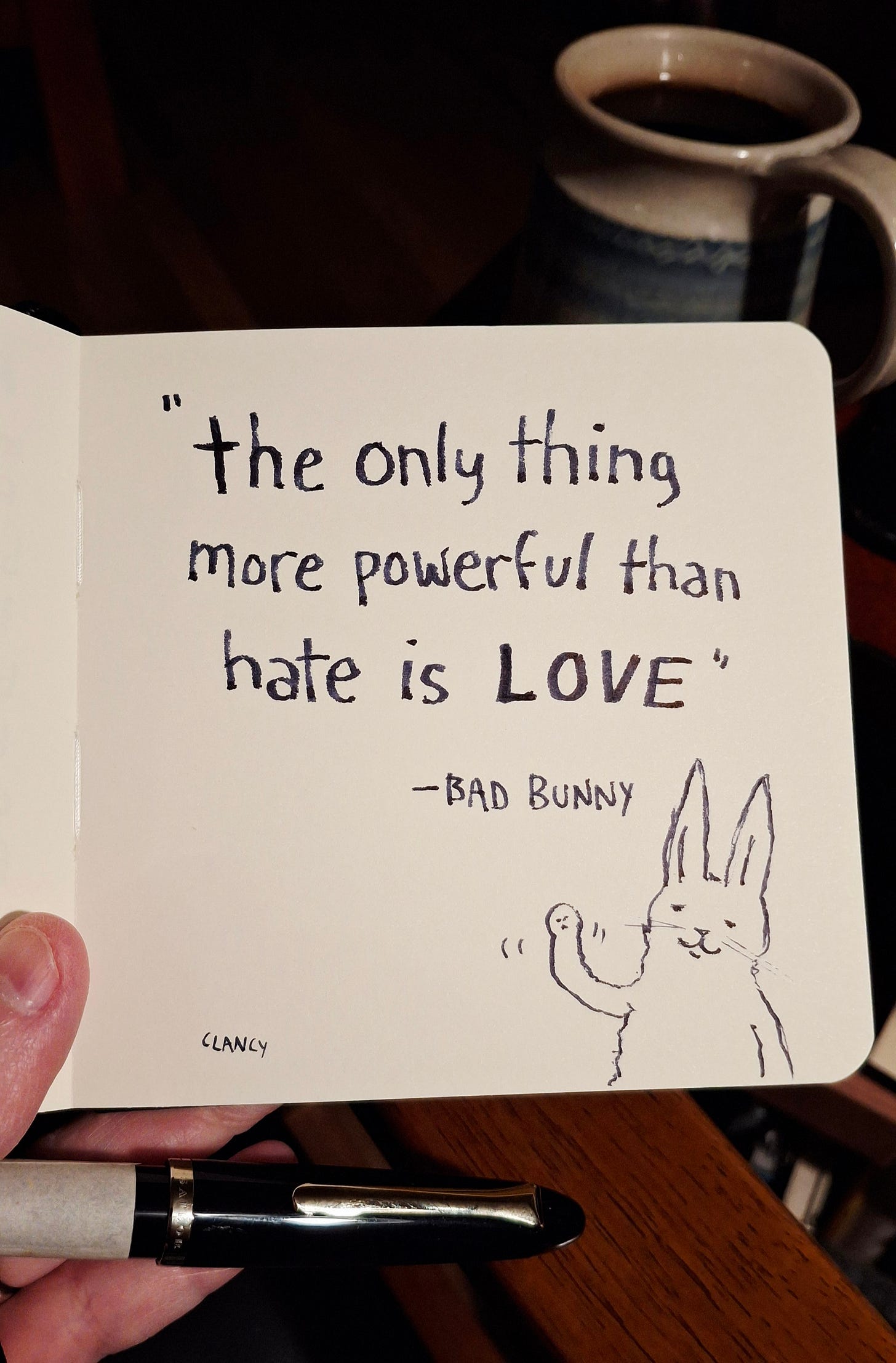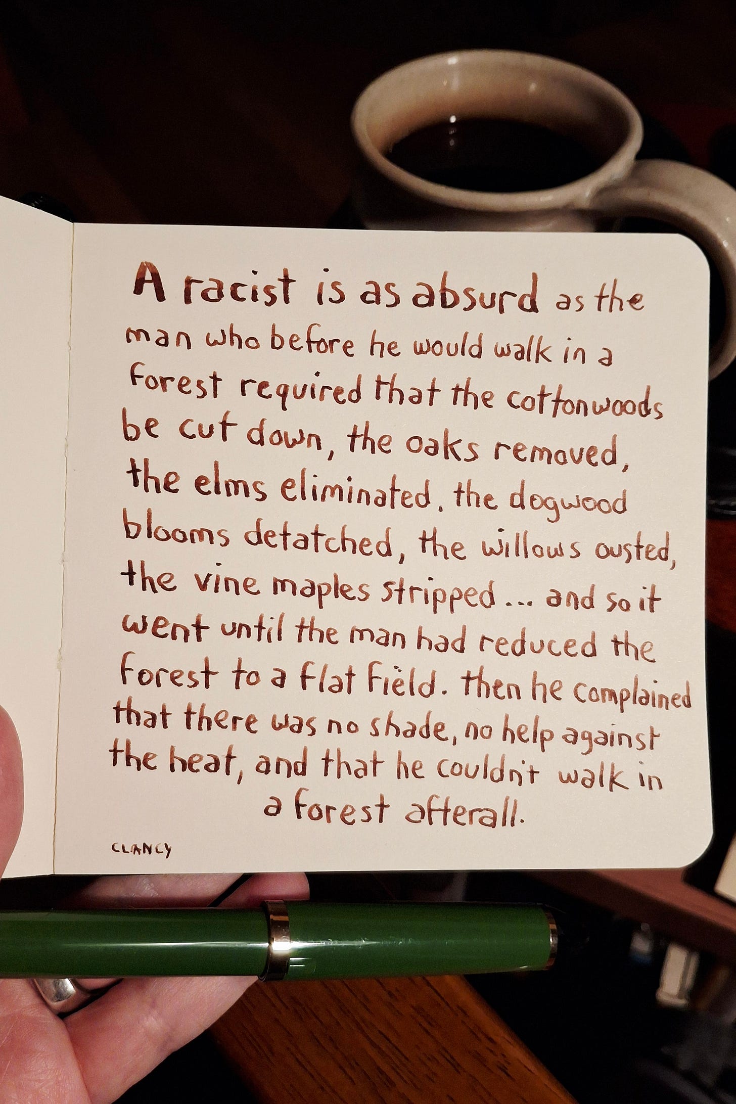 I love everything about your post this week. So much gratitude in the "mundane" for me. And the wisdom contained in this week's post related to human relationships is precisely what humanity needs, I think. I agree with what's been said here re: your illustration of racism and the ridiculousness of it all--it should be on billboards! I want it framed and hanging in my office.