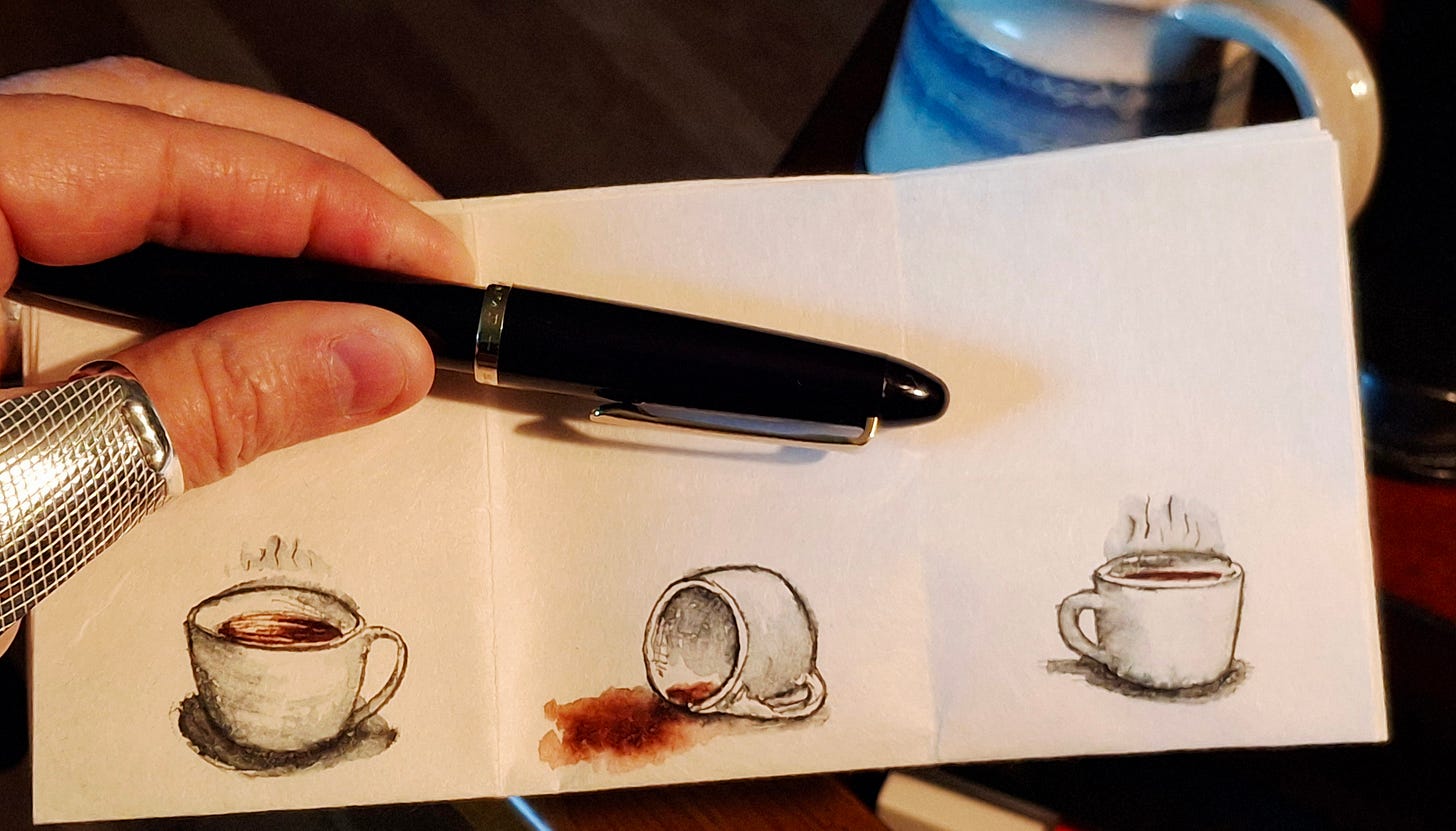 This week a dear friend, Beverly Herndon who, besides being a long-term good friend, is an accomplished Asian brushwork artist (whose artworks my wife and I have saved our pennies in order to purchase, and have been lucky enough to have on occasion received as gifts from the artist herself) reminded me of the various wet-in-wet ink wash techniques. Those techniques might be a bit easier on my thumbs. 🤔 So I did a practice sketch following her suggestions…